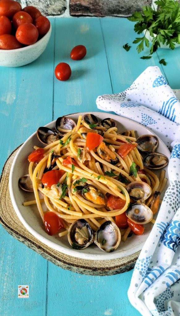 Bereiten Sie auch die Pasta mit Miesmuscheln, Venusmuscheln und Kirschtomaten zu und lassen Sie sich von den authentischen Aromen des Meeres verzaubern.