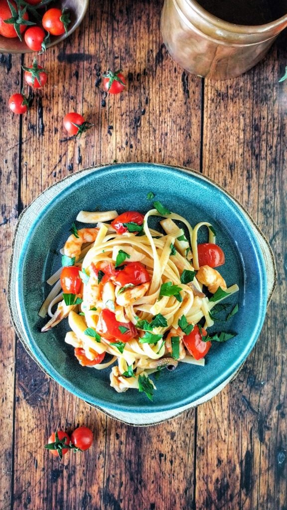 Im gleichen Topfboden die Tintenfische 7-8 Minuten lang kochen und gelegentlich umrühren. Den restlichen Weißwein dazugeben und ablöschen. Nun auch die Garnelen hinzufügen und einige Minuten vermengen. Die Kirschtomaten dazugeben und für weitere 5 Minuten weiterkochen. Mit etwas gehackter frischer Petersilie abschließen.