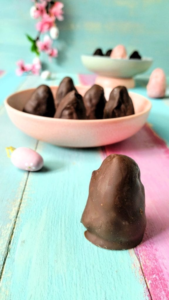 Nach der Ruhezeit tauchen Sie die Eier in die geschmolzene dunkle Schokolade. und legen Sie sie auf ein Blatt Backpapier oder in Papierförmchen.