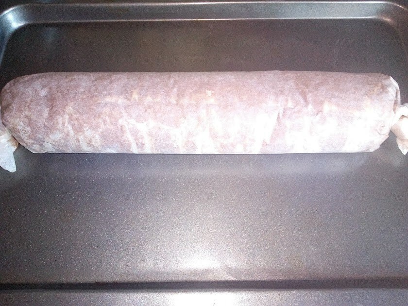 Den Schokoladensalami auf einem Tablett in den Kühlschrank stellen und über Nacht ruhen lassen.