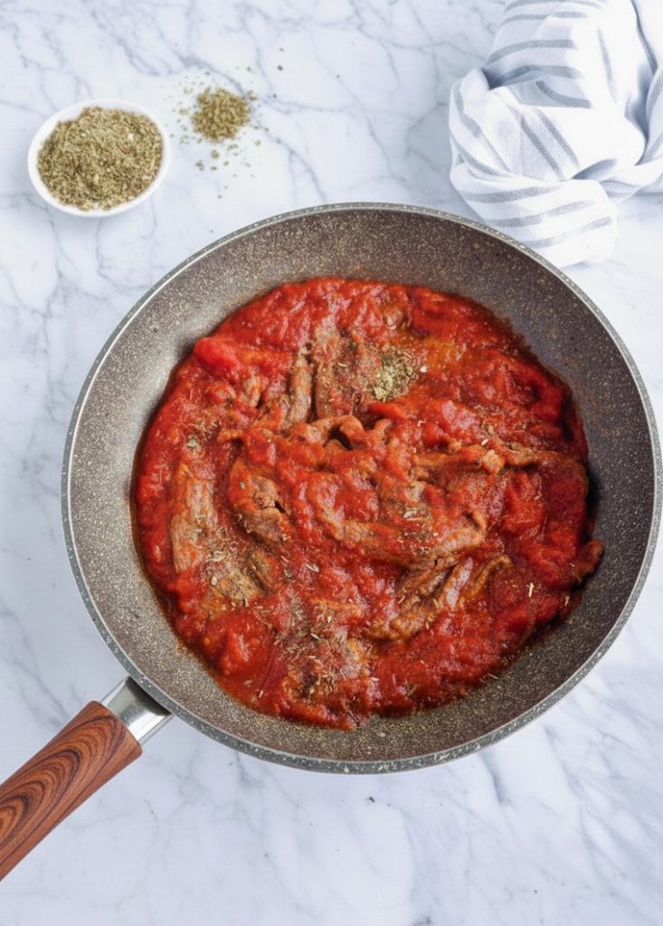 Geben Sie die zerdrückte Knoblauchzehe in den Bratsatz, lassen Sie sie goldbraun werden und fügen Sie dann das Tomatenfleisch hinzu. Würzen Sie mit Salz und einem Esslöffel Oregano. Nach etwa zehn Minuten fügen Sie das Fleisch den Tomaten hinzu und lassen es für ein paar Sekunden durchziehen.