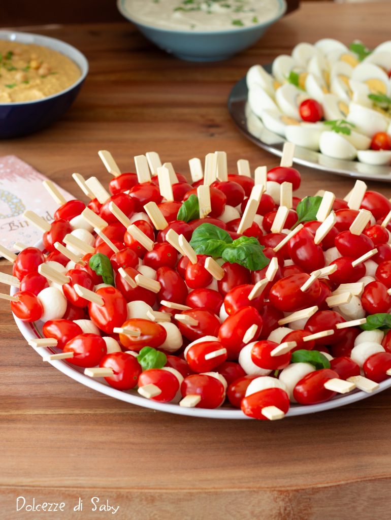Heute möchte ich Ihnen mehr eine Idee als ein Rezept für ein Buffet vorschlagen und Ihnen einige Tipps geben, die mir bei der Vorbereitung von großen Buffets nützlich waren. So bereiten Sie eine perfekte Caprese für ein Buffet vor. Wie bereits erwähnt, wissen viele, wie man eine klassische Caprese zubereitet, indem man die Tomaten und den Mozzarella in Scheiben schneidet und die Scheiben abwechselnd auf einer Servierplatte anordnet, natürlich gewürzt mit Öl, Salz, Pfeffer und für diejenigen, die es mögen, auch Oregano. Aber heute möchte ich Ihnen eine Caprese für Buffet vorschlagen, die dekorativer ist und als Fingerfood serviert werden kann.