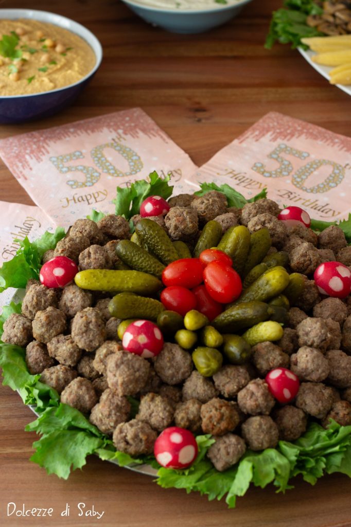 Wenn Sie alle Fleischbällchen fertig gebacken haben, legen Sie sie auf eine Servierplatte und dekorieren Sie sie mit Tomaten, Essiggurken und Radieschen (in Pilzform geschnitten), wie ich es gemacht habe, das wird toll aussehen.