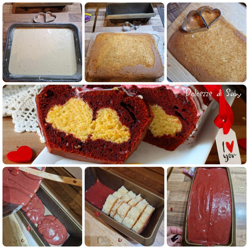 • Sobald das Biskuit fertig ist, lassen Sie es gut abkühlen und stürzen Sie es auf ein Schneidebrett oder eine Arbeitsfläche. Schneiden Sie nun mit den beiden Herzausstechern, die nebeneinander platziert sind, viele Herzen über die gesamte Länge des Biskuits aus. Nehmen Sie die Plumcake-Form und geben Sie 2-3 Esslöffel roten Teig auf den Boden. Positionieren Sie nun alle ausgeschnittenen Herzen entlang der Länge der Plumcake-Form und gießen Sie schließlich den restlichen roten Teig darüber. Backen Sie ihn dann im heißen Ofen bei 180° für ca. 40 Minuten. Sobald Ihr Red Velvet Plumcake fertig ist, dekorieren Sie ihn mit weißer und rosa Glasur und Zuckerherzen. Guten Appetit und einen schönen Valentinstag.