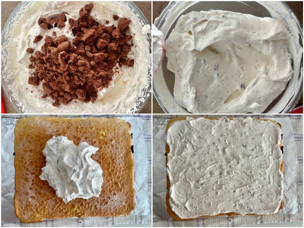Innen befindet sich eine leckere, cremige Füllung aus Schlagsahne, Kondensmilch und zerbröselten Schokoladenkeksen, die diese Rolle unwiderstehlich macht, perfekt als Dessert am Ende einer Mahlzeit oder für einen besonderen Snack.