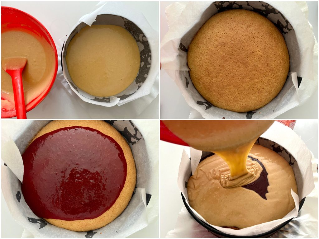 Gieße die Hälfte des Teigs in eine mit Backpapier ausgelegte 22 cm Form und backe sie bei 180 Grad für 20 Minuten.