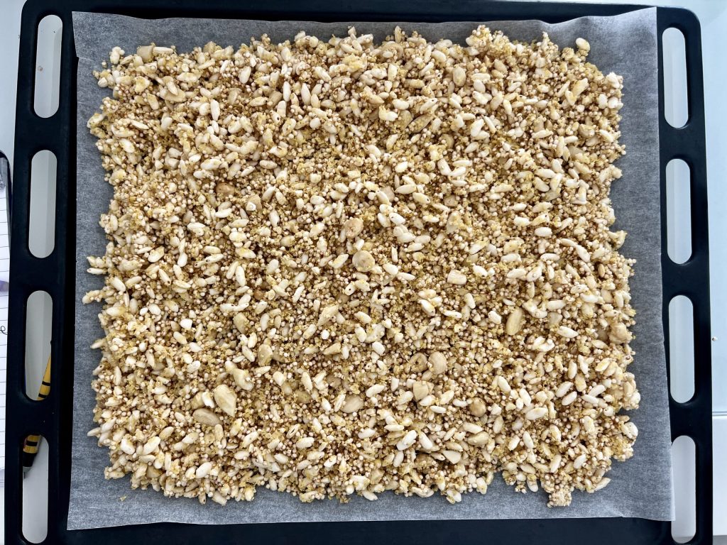 Sobald es fertig ist, das Granola aus dem Ofen nehmen und komplett abkühlen lassen: Beim Abkühlen wird es noch knuspriger.