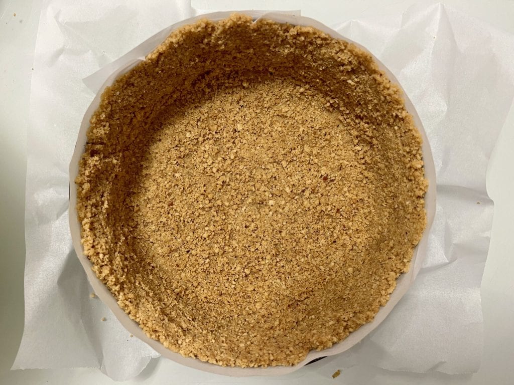 Beginne mit der Zubereitung der Schale, indem du die Kekse pulverisierst, das Mandelmehl, den Zucker und die geschmolzene Butter hinzufügst. Gut mischen.