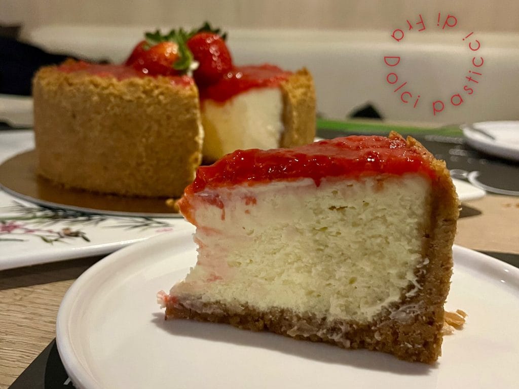 Der New York Cheesecake mit weißer Schokolade und Erdbeeren hat einen Boden aus glutenfreien Honigkeksen, eine reichhaltige Frischkäsecreme, die durch weiße Schokolade noch köstlicher wird, und eine Schicht Erdbeeren als Topping …