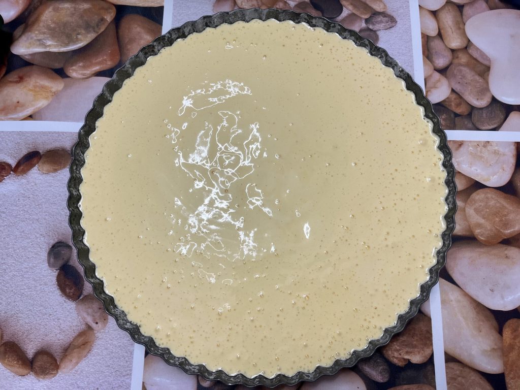 Bereite den Boden vor. Trenne die Eier, schlage die Eiweiße einige Minuten lang auf, indem du nach und nach den Zucker hinzufügst, wenn sie steif sind, füge die Eigelbe weiterhin unter Rühren hinzu, die Prise Salz, die Vanille und das Öl. Nun mit einem Spatel das zuvor gesiebte Mehl unterheben.