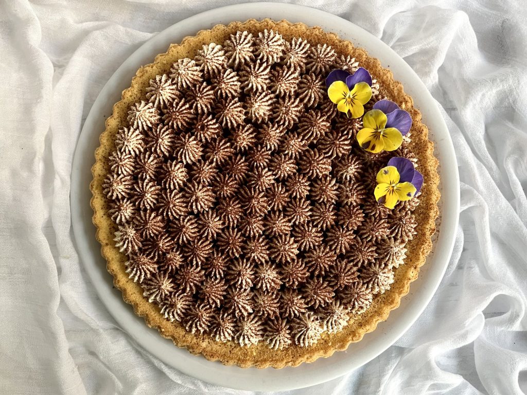 Fülle die Creme in einen Spritzbeutel, ich habe eine flache Tülle verwendet, bedecke die Torte mit der Creme. Du kannst auch eine runde Tülle verwenden, um Tupfen zu machen.