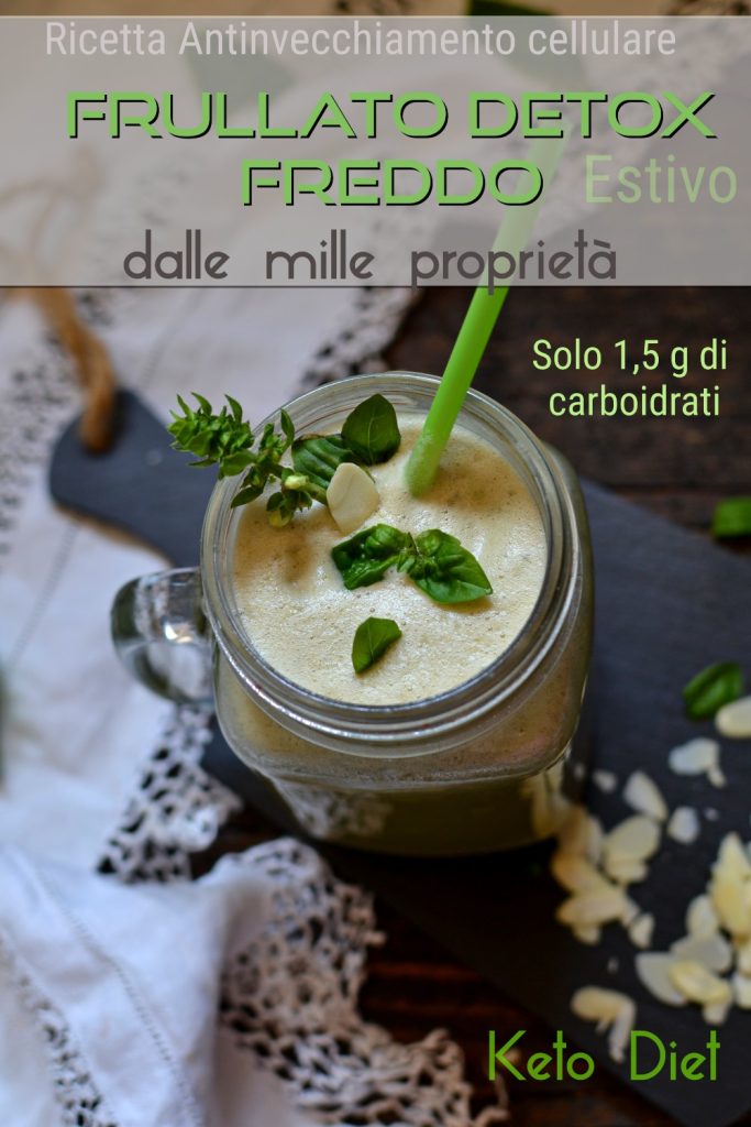 Heute bereiten wir einen Smoothie vor (mit nur 1,5 g Kohlenhydraten), auf Basis von Mandeln, die antioxidative Eigenschaften besitzen (zelluläres Anti-Aging). Außerdem können sie das schlechte Cholesterin senken, das gute fördern, Triglyceride, Blutdruck und Blutzucker positiv beeinflussen. Ein wahres Gesundheitselixier für den ganzen Körper. Nicht zu vergessen: Mandeln helfen auch bei Lippenherpes, Pilzinfektionen (Candida) und stärken das Immunsystem. Wir fügen frischen Basilikum hinzu (nicht getrocknet und am besten von einer bereits gewachsenen Pflanze gepflückt), reich an Omega-3-Fettsäuren (zur Verringerung allgemeiner Entzündungen im Körper), reich an Eugenol wie in Nelken, eine hilfreiche Substanz zur Kontrolle von rheumatoider Arthritis, Arthrose, Darmentzündungen und Entzündungen der Mundhöhle. Außerdem ist Basilikum ein starkes Verdauungsmittel, das auch Übelkeit lindern kann. Es hat auch Effekte auf den Stoffwechsel, die Blutgerinnung und die Entwicklung des Nervensystems während der Schwangerschaft; in diesem Zusammenhang ist zu wissen, dass Basilikum reich an Flavonoiden ist und daher die Milchproduktion während der Stillzeit anregen kann. Aber das ist noch nicht alles, denn ein Basilikumtee kann bei kontinuierlicher Einnahme auch Angstzustände reduzieren, da er sedierende Eigenschaften hat. Schließlich ist es auch sehr nützlich als Wurmmittel (wie Knoblauch).