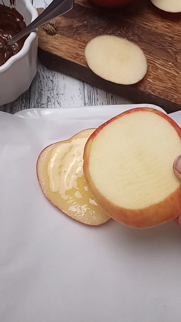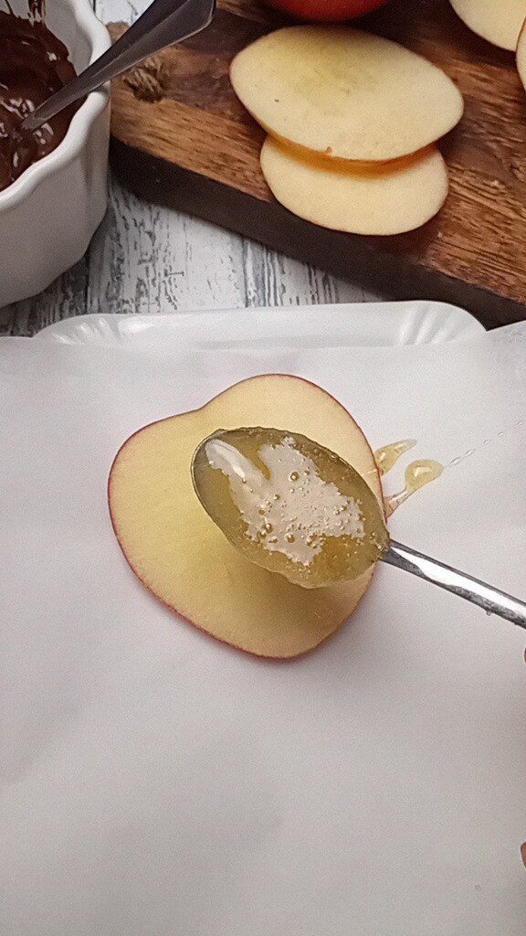 Auf die Hälfte der erhaltenen Apfelscheiben streichen wir eine leichte Schicht Honig.