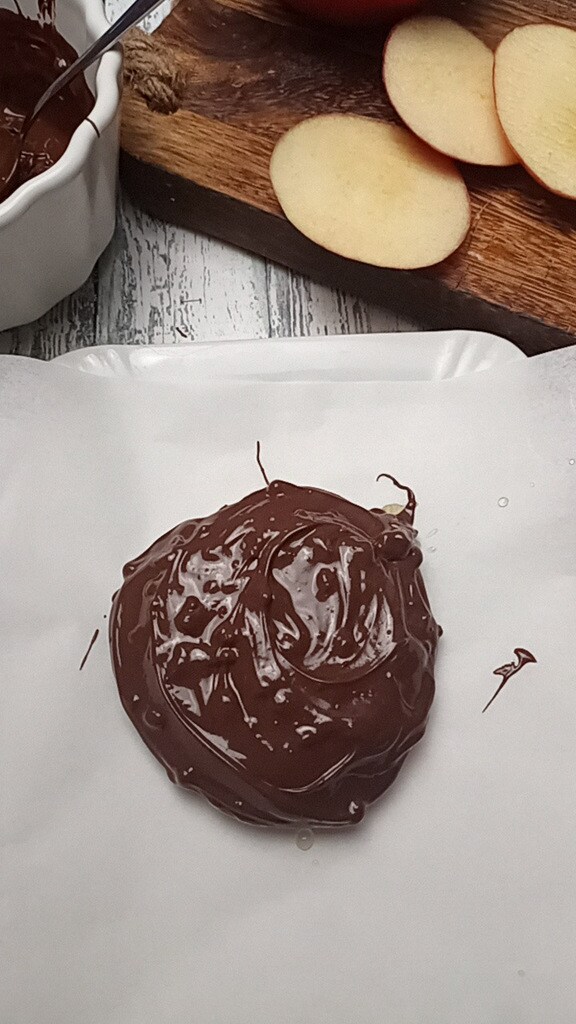 Bedecken wir jede Apfelportion mit der Schokolade, sodass sie an den Rändern herunterläuft.