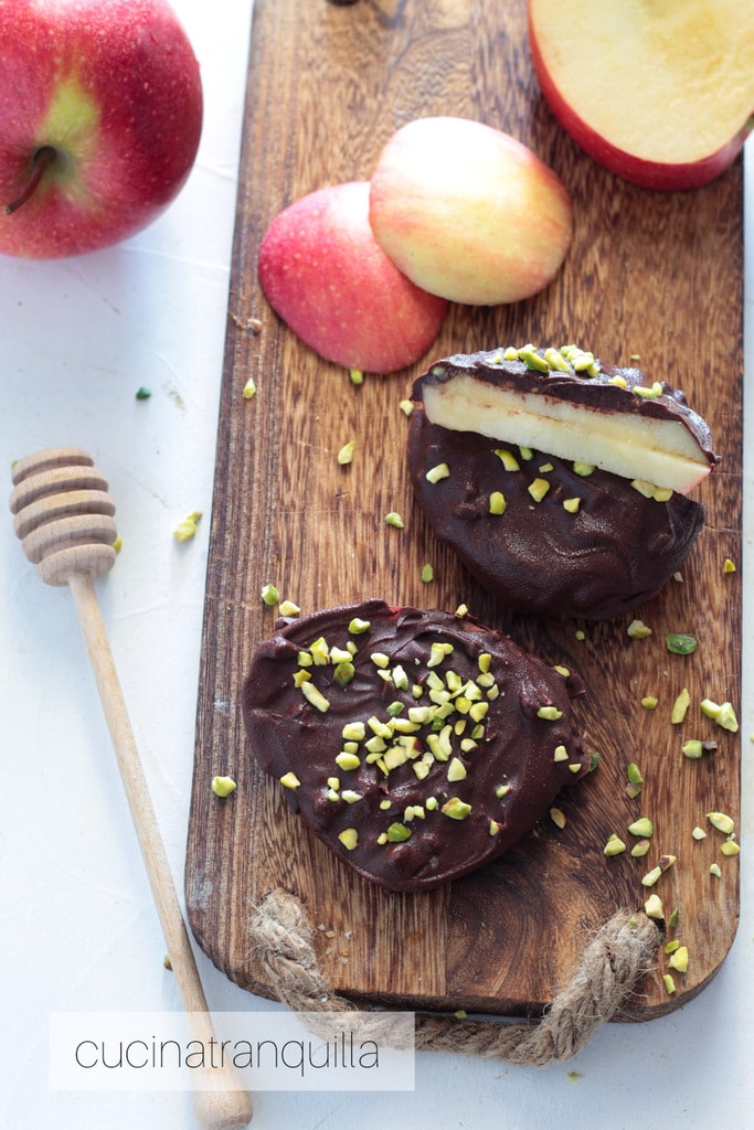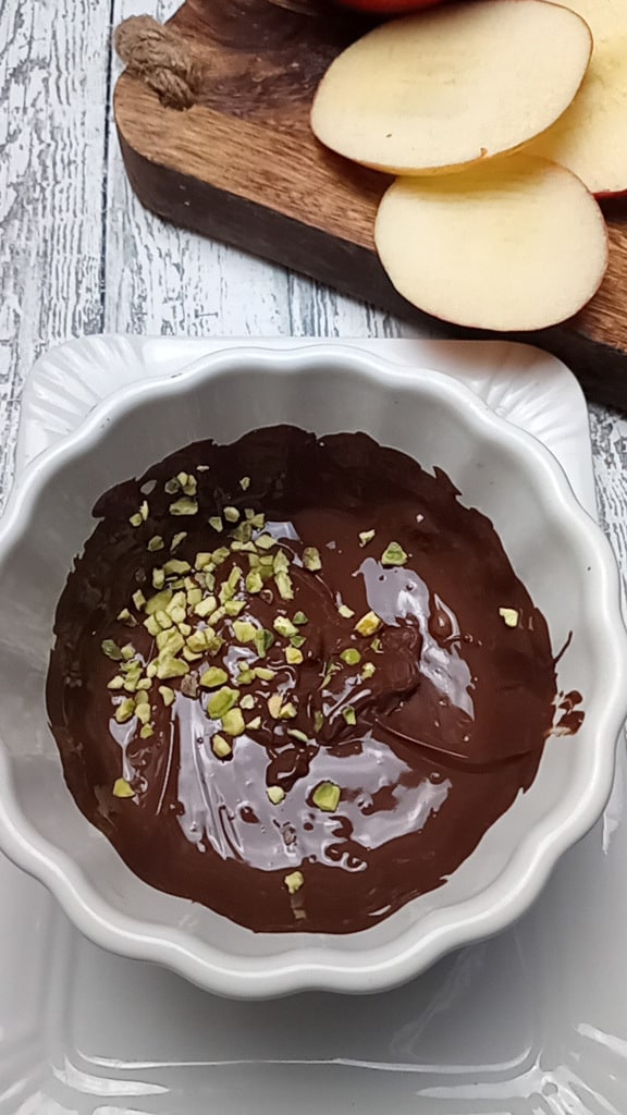 Apple Snack mit Red Delicious Apfel, Zartbitterschokolade und gehackten Pistazien, ein perfektes Rezept für jeden Moment des Tages, das nur einen kurzen Kochvorgang erfordert.