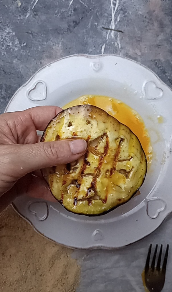 Legen wir auf eine Seite die Käsescheibe und schließen die Aubergine, indem wir sie mit der anderen Scheibe bedecken.