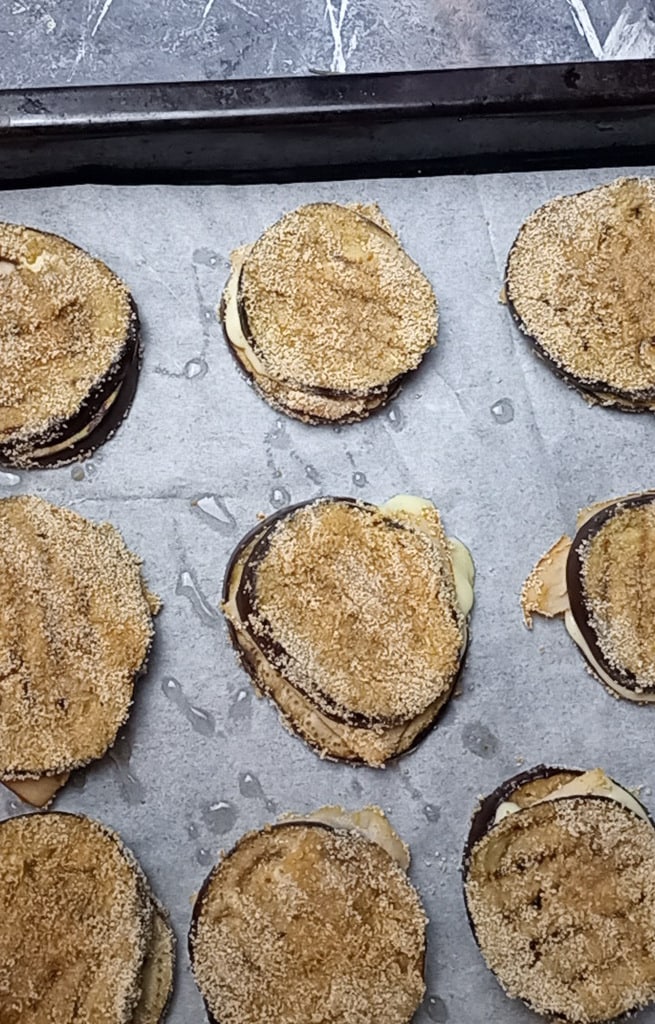 Paare die Auberginenscheiben und ordne sie nebeneinander an.