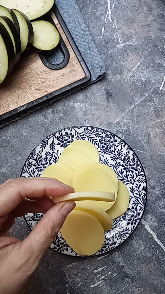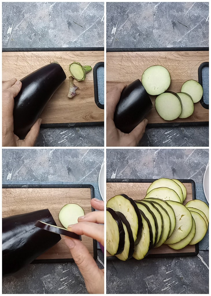 Um die Auberginen-Cordon-Bleu mit zart schmelzendem Käse zuzubereiten, waschen wir zuerst die Auberginen, entfernen den Stiel und schneiden sie in ziemlich dünne Scheiben.