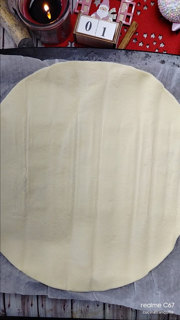 Um den Blätterteigstern mit Philadelphia und Lachs zu machen, rollen wir zunächst die erste runde Blätterteigbasis aus.