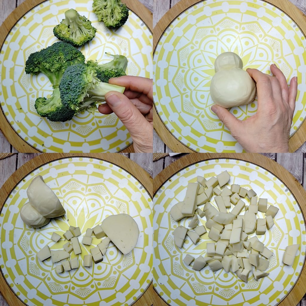 Um den Brokkoli und Käse Auflauf zu machen, putzen Sie zuerst den Brokkoli, indem Sie die Blüten vom Stiel trennen. Waschen Sie sie und blanchieren Sie sie 10 Minuten in reichlich Salzwasser. Abtropfen lassen und abkühlen lassen. Schneiden Sie in der Zwischenzeit den Scamorza in Würfel.