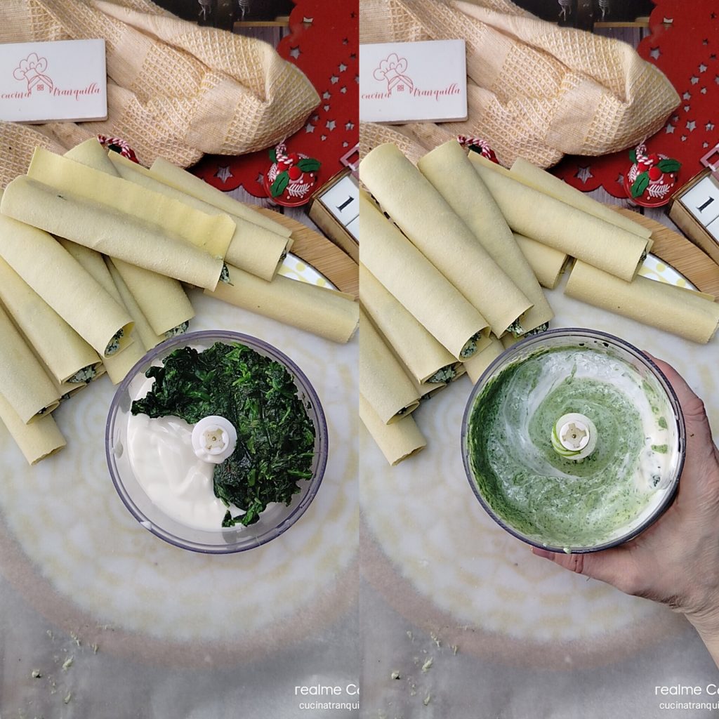• In der Zwischenzeit können Sie auch die Béchamelsauce vorbereiten, indem Sie, wenn Sie möchten, meinem Rezept folgen. Auch diese sollte gut abgekühlt werden. Im Behälter des Küchengeräts oder in einem Glas fügen Sie den restlichen Spinat hinzu. Pürieren Sie alles, bis eine homogene Creme entsteht.