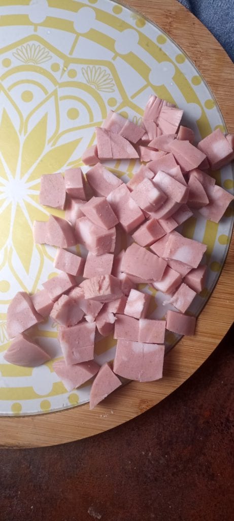 Schneide währenddessen die Mortadella in Würfel oder nach Belieben.