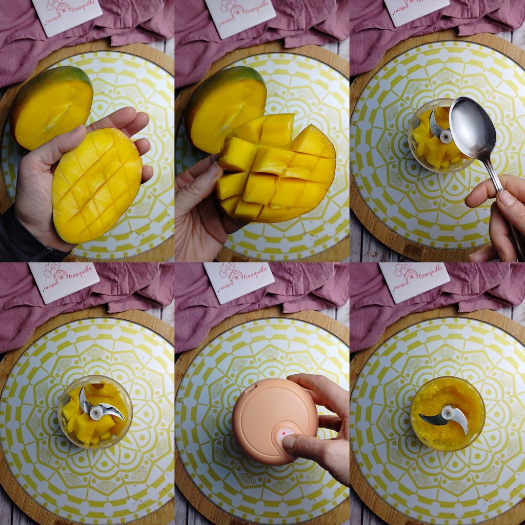 • Um den Chia-Pudding mit Mango und Kiwi zuzubereiten, schneidet ihr zuerst die Mango vom Stein und ritzt sie ein, um das Fruchtfleisch von der Schale zu lösen. Pürriert die Hälfte davon kurz mit einem Esslöffel Süßungsmittel, bis eine cremige, homogene Masse entsteht.