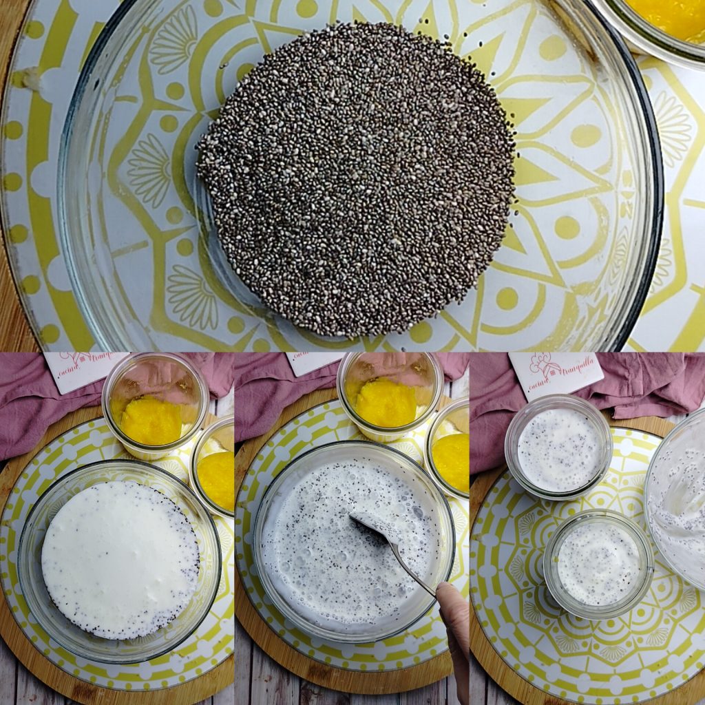 Chia-Pudding mit Mango und Kiwi, ein leichtes, energiereiches Rezept, genau süß genug durch frisches Obst. Für dieses Rezept habe ich ein leckeres weißes Kefir-Joghurt und gelbe Kiwi verwendet, aber für einen Farbtupfer könnt ihr auch grüne Kiwi und viele Tropfen Zartbitterschokolade nehmen. Ideal zum Vorbereiten am Abend zuvor, ist diese Idee dennoch auch schon ein paar Stunden nach der Zubereitung genießbar, denn dank der Chia-Samen wird sie sofort zu einem „Pudding“ – gesund und lecker. Unten gebe ich euch weitere Ideen zur Verwendung von Chia-Samen, und am Ende des Rezepts, das alle Fotosteps enthält, beantworte ich die häufigsten Fragen zu diesem Thema.