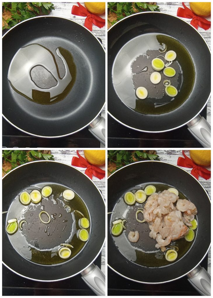 Gieße das Öl in eine große Pfanne, brate den Lauch 2 Minuten an und füge die Garnelen hinzu.