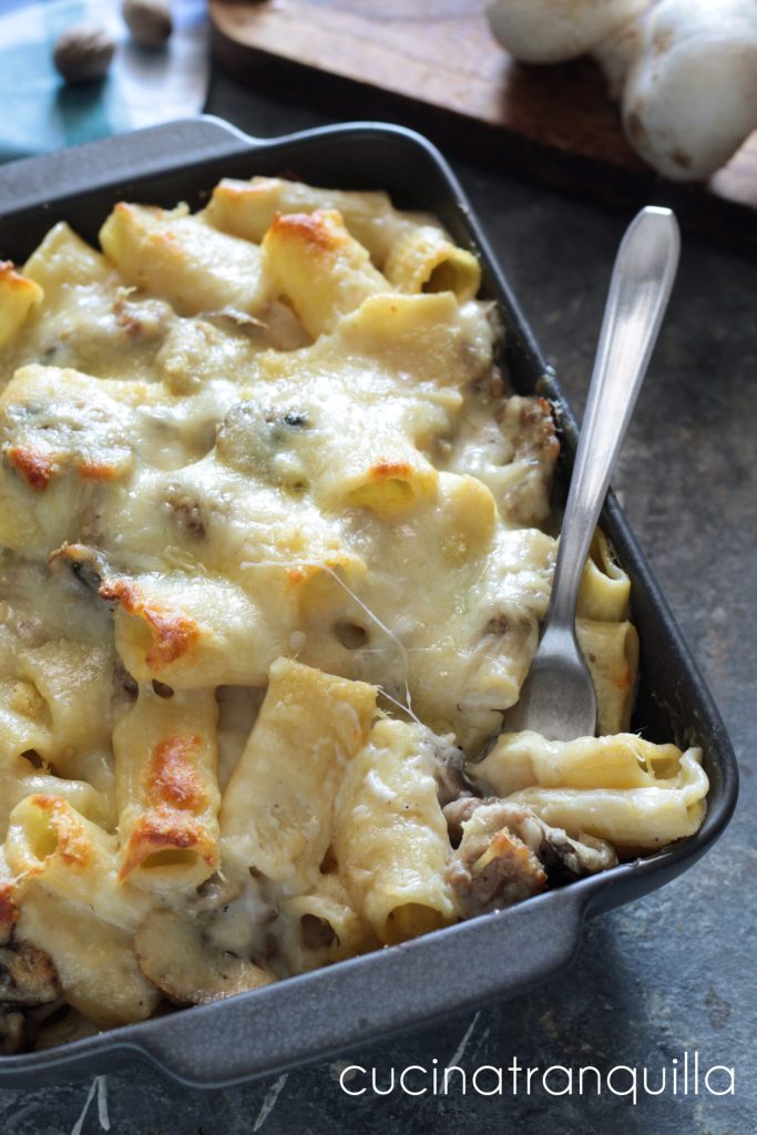 Gebackene Pasta mit Pilzen und Wurst mit laktosefreier Béchamelsauce