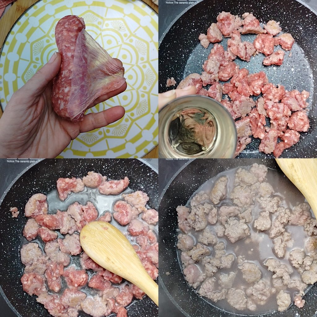 • Entfernen Sie die Haut von den Würsten, bröckeln Sie sie grob und kochen Sie sie in einer Pfanne mit einem halben Glas Weißwein, ohne weitere Zutaten hinzuzufügen.