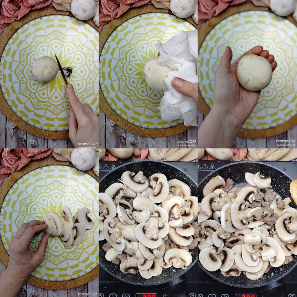 • Sobald alle Zutaten bereit sind, setzen Sie sie zusammen. Geben Sie in der Schüssel die Wurst und die gekochten Pilze zur Pasta. Fügen Sie zwei Drittel des Käses und des Mozzarellas, die Béchamelsauce hinzu und mischen Sie. Gießen Sie alles in die leicht geölte Auflaufform und ebnen Sie es ein. Garnieren Sie mit dem restlichen Käse und dem Mozzarella. Ich habe bereits in Julienne geschnittenen Mozzarella verwendet, aber Sie können den bevorzugten bei der Verwendung frisch schneiden.