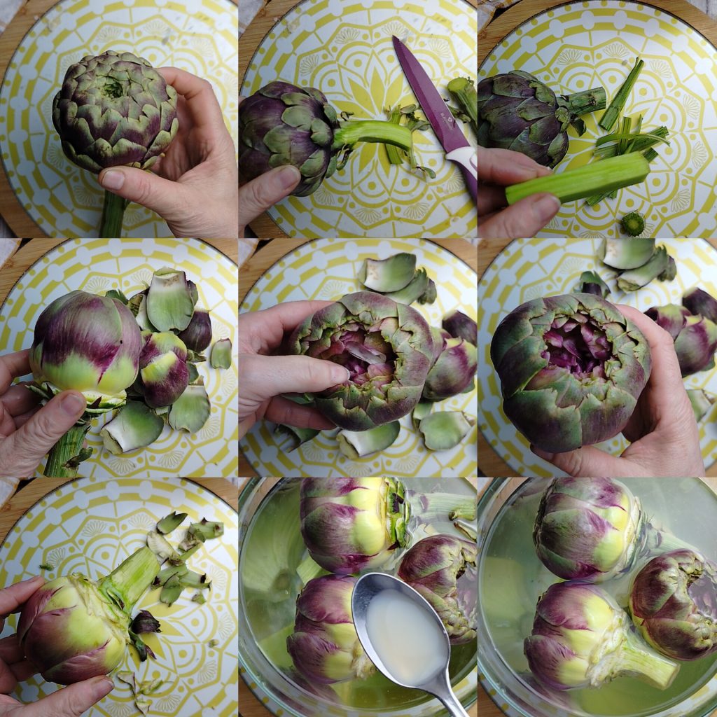 Um die gefüllten Artischocken mit Brot und Scamorza zuzubereiten, putzen Sie zuerst die Artischocken gründlich. Schneiden Sie den überstehenden Teil des Stiels ab und entfernen Sie mit einem Messer den holzigen Teil. Entfernen Sie die härtesten Blätter, bis Sie die helleren Blätter erreichen. Reinigen Sie die Ansatzstelle der Artischocken gut und legen Sie sie in eine Schüssel mit kaltem Wasser und Zitrone, nachdem Sie sie mit den Händen leicht geöffnet haben.