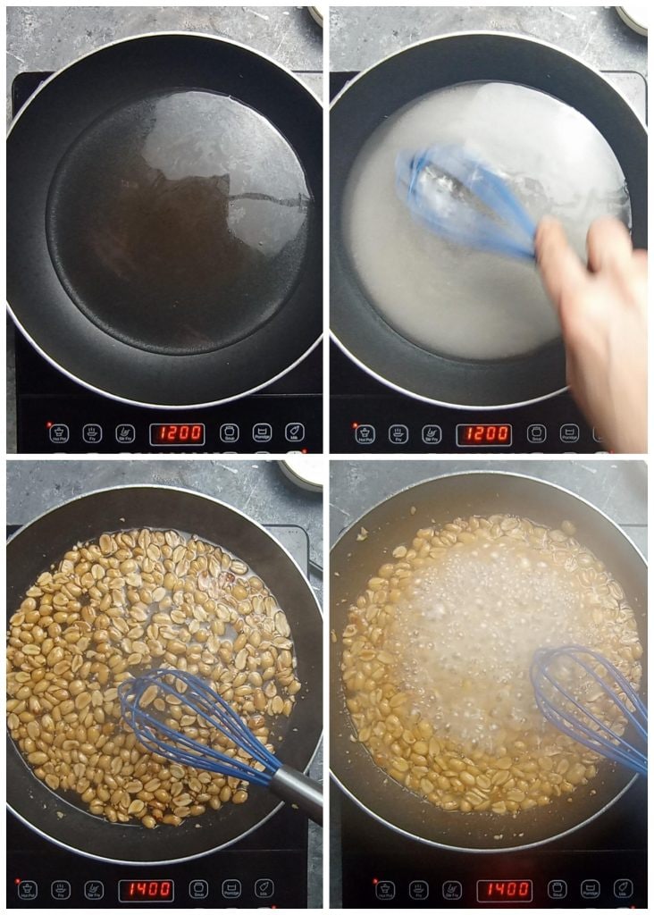 • Um die gesalzenen kandierten Erdnüsse herzustellen, erhitzen Sie zuerst das Wasser in einer Antihaftpfanne für eine Minute.