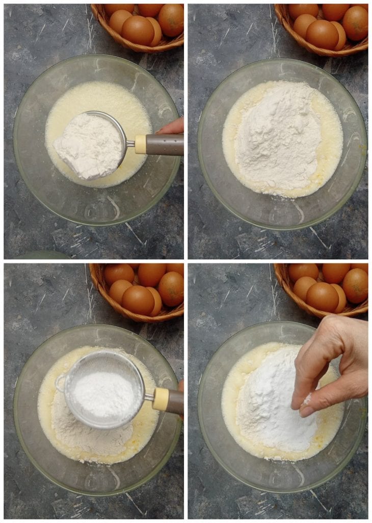 Wir fügen das gesiebte Mehl, das Backpulver und eine Prise feines Salz hinzu.