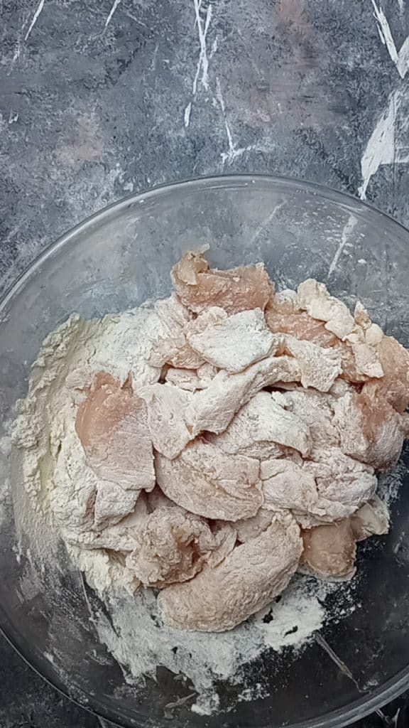• Die Hähnchenstücke panieren, überschüssiges Mehl entfernen.