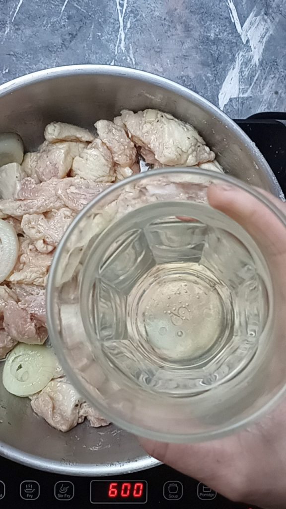 • Die Hähnchenstücke hinzufügen und eine Minute anbraten, dabei umrühren.