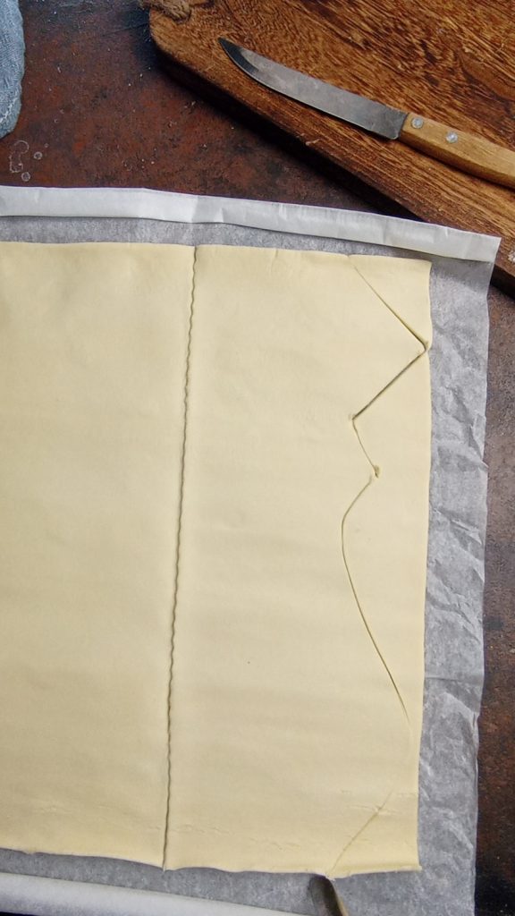 Um die herzhafte Blätterteig-Krawatte herzustellen, rolle zuerst den Blätterteig aus und falte ihn längs in der Mitte.