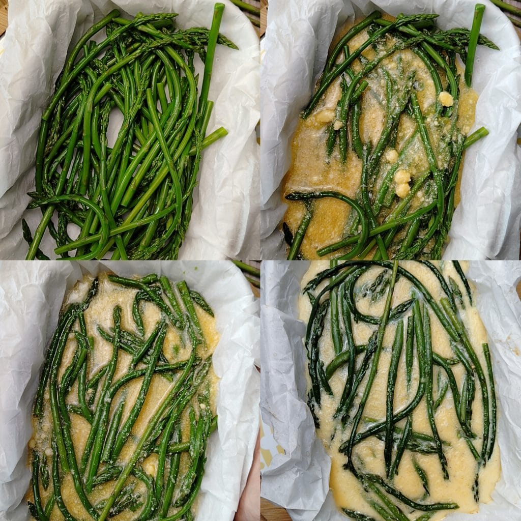 • Legen Sie eine Auflaufform von ca. 30 cm Länge mit nassem und ausgewrungenem Backpapier aus und legen Sie die Spargel auf den Boden.