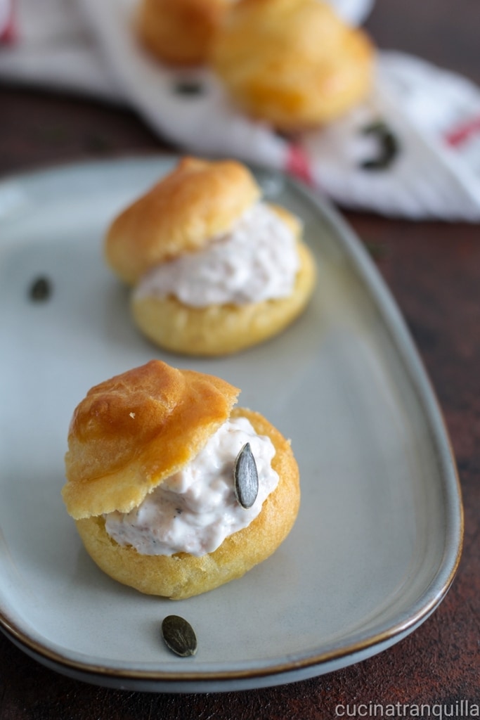 Sie können auch die im Handel erhältlichen Windbeutel verwenden. Was ich Ihnen vorschlage, ist eine neutrale Basis, also achten Sie darauf, dass diese auch gekauft wird. Anstelle der Kürbiskerne können Sie gehackte Pistazien verwenden: Das wird ein großartiger Ersatz sein.