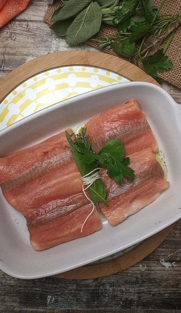 Um den im Ofen marinierten Lachs mit Kräutern zuzubereiten, folgen Sie zunächst, wie oben beschrieben, der angegebenen Methode zum Auftauen des Fisches, wenn Sie den tiefgefrorenen verwenden.