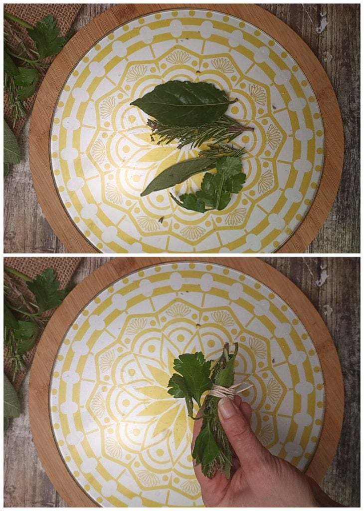 Waschen und trocknen Sie die Blätter der Kräuter und binden Sie sie mit einem Küchengarn zusammen.