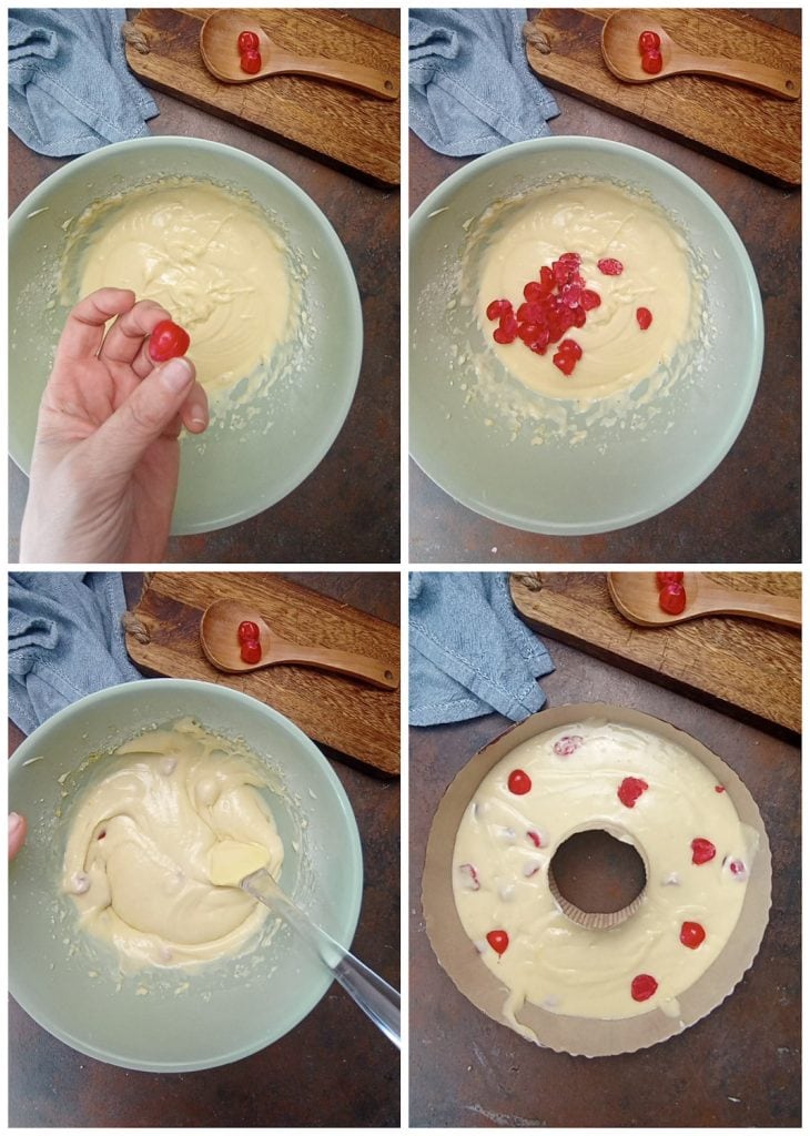 Fügen Sie die kandierten Kirschen hinzu, am besten wenn sie halbiert sind, und mischen Sie erneut.