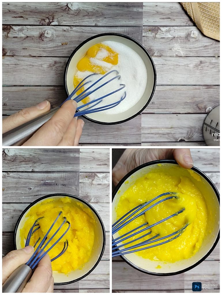 Um die Kakaopuddingcreme zu machen, verrühre die Eigelbe für einige Augenblicke in einer Schüssel mit dem Zucker, bis eine helle Creme entsteht.