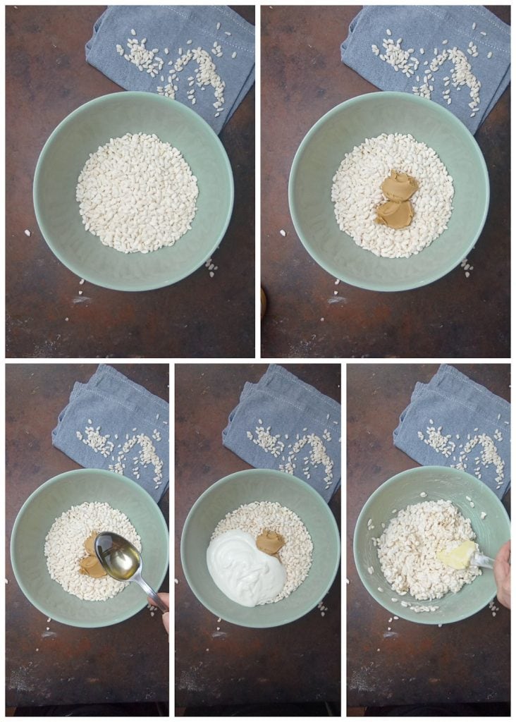 Um den Kalten Kuchen mit Puffreis und Erdnussbutter mit Joghurt zuzubereiten, geben wir den ganzen Puffreis in eine große Schüssel, mischen ihn mit den zwei Esslöffeln Erdnussbutter, dem Esslöffel Agavendicksaft und dem Naturjoghurt, bis eine homogene Masse entsteht.