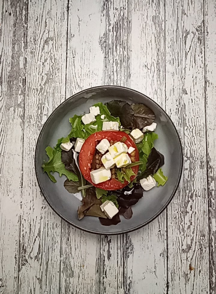 • Wir füllen die Tomate mit etwas Salat und fügen zwei Esslöffel Linsen hinzu.