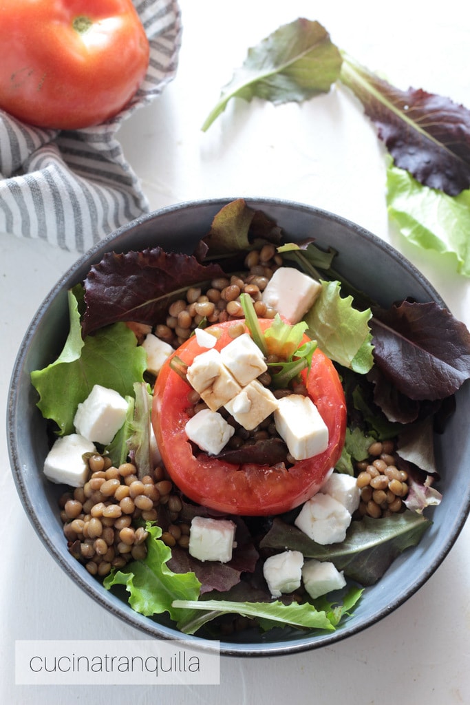 Kalter Tomatensalat mit Linsen und Feta, ein sehr einfaches Rezept ohne Kochen.