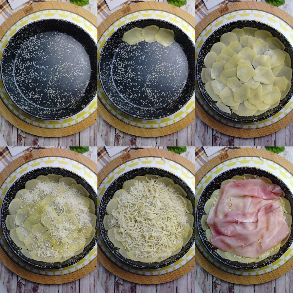 • Befeuchte den Boden der Auflaufform mit etwas Öl und lege die Kartoffelscheiben wie auf dem Foto, leicht überlappend. Garniere mit einem Teil des geriebenen Käses und der Mozzarella und dann mit dem gekochten Schinken.