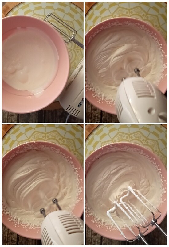 Es reicht, die Sahne gut aufzuschlagen und mit dem Mascarpone zu vermischen, dann haben wir in kurzer Zeit einen leckeren Kuchen.