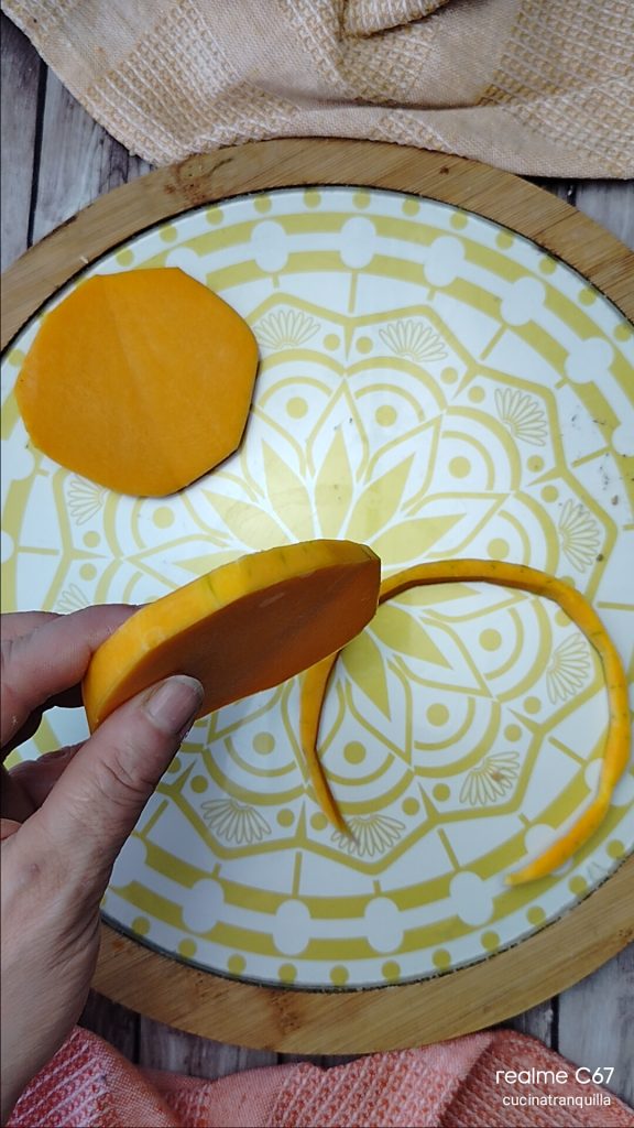 Um die Kürbiscreme und den Stracchino zuzubereiten, schneiden Sie zuerst 300 g Kürbis in dünne Scheiben, wie auf dem Foto.